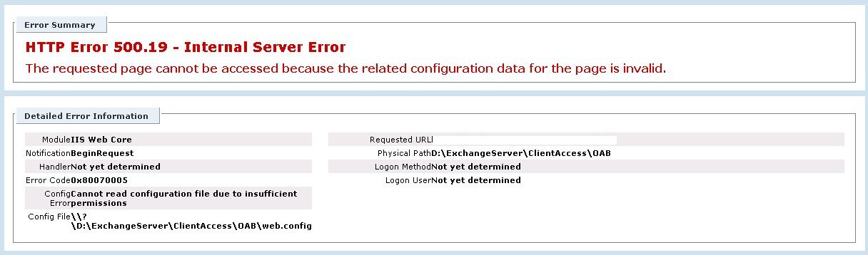 As you can see in the screenshot above IIS has some issues while reading the config file. In this case this was caused by an webconfig.xml file which was placed in the OAB virtual directory. This resulted in problems while downloading the OAB when using Outlook 2007/2010.